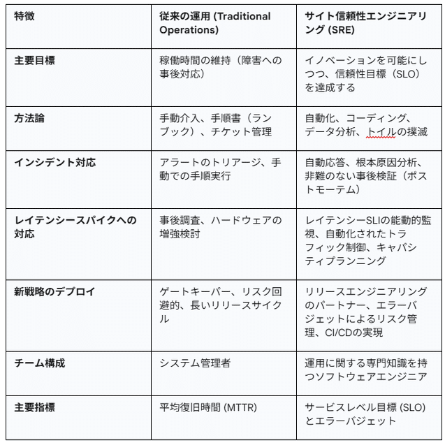 SREは、Googleによって提唱され、インフラと運用の問題をソフトウェアの問題として扱うことを中核とする 16。従来の運用チームがインシデントへの事後対応に追われるのに対し、SREチームはコードを記述することで、障害を予測し、未然に防ぐことを目指す 19。