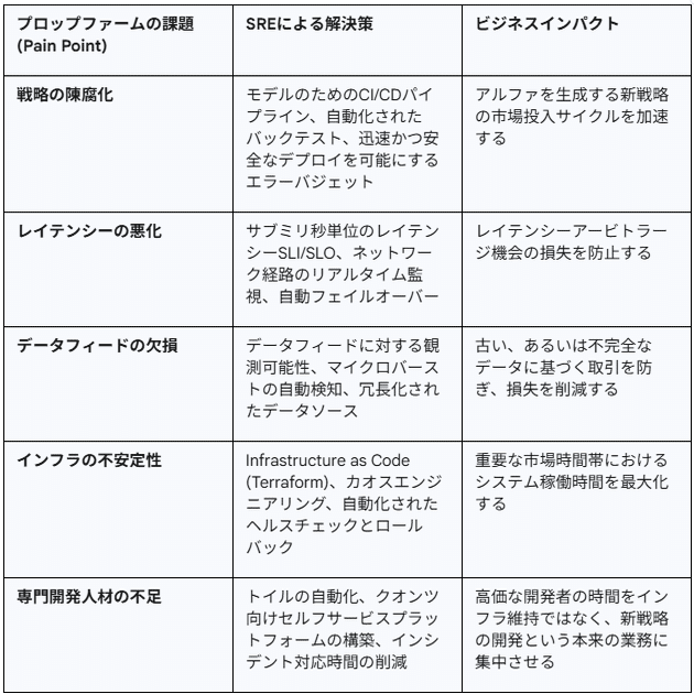 このように、SREはプロップファームが抱える中核的な技術的・事業的課題に対し、具体的かつ効果的な処方箋を提供する工学的アプローチなのである。