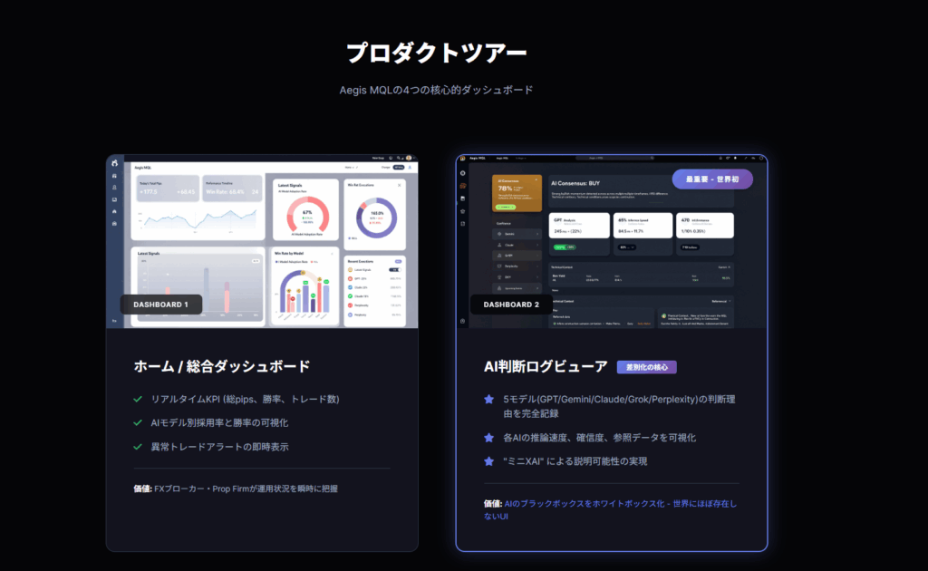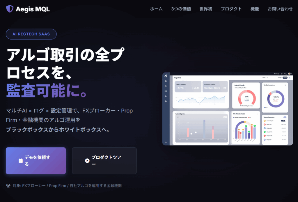 Aegis MQL(イージス・エムキューエル)は、取引AIの「判断理由」と「運用品質」をリアルタイムで可視化し、法的に有効な証跡として保全するクラウド基盤です。